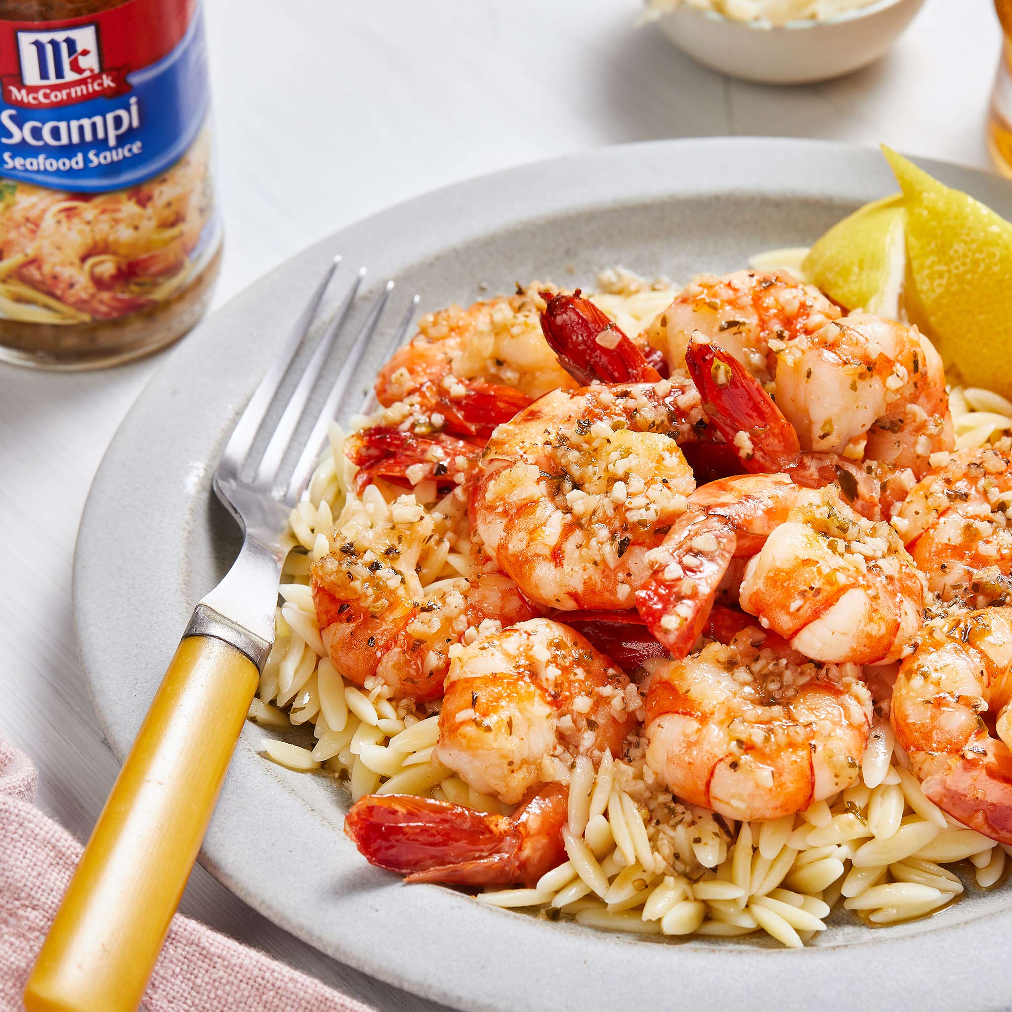 McCormick Scampi Seafood Sauce, It just doesn’t get much easier. And, people love the flavor! Add shrimp to this delicious sauce with garlic, red pepper, oregano and basil for great tasting scampi in less than 15 minutes. Simply heat 1/2 cup McCormick Golden Dipt Scampi Seafood Sauce in a large skillet on medium heat. Add 1 pound large shrimp, peeled and deveined. Cook and stir 4 minutes, or just until shrimp turn pink. Serve over rice or pasta, if desired.